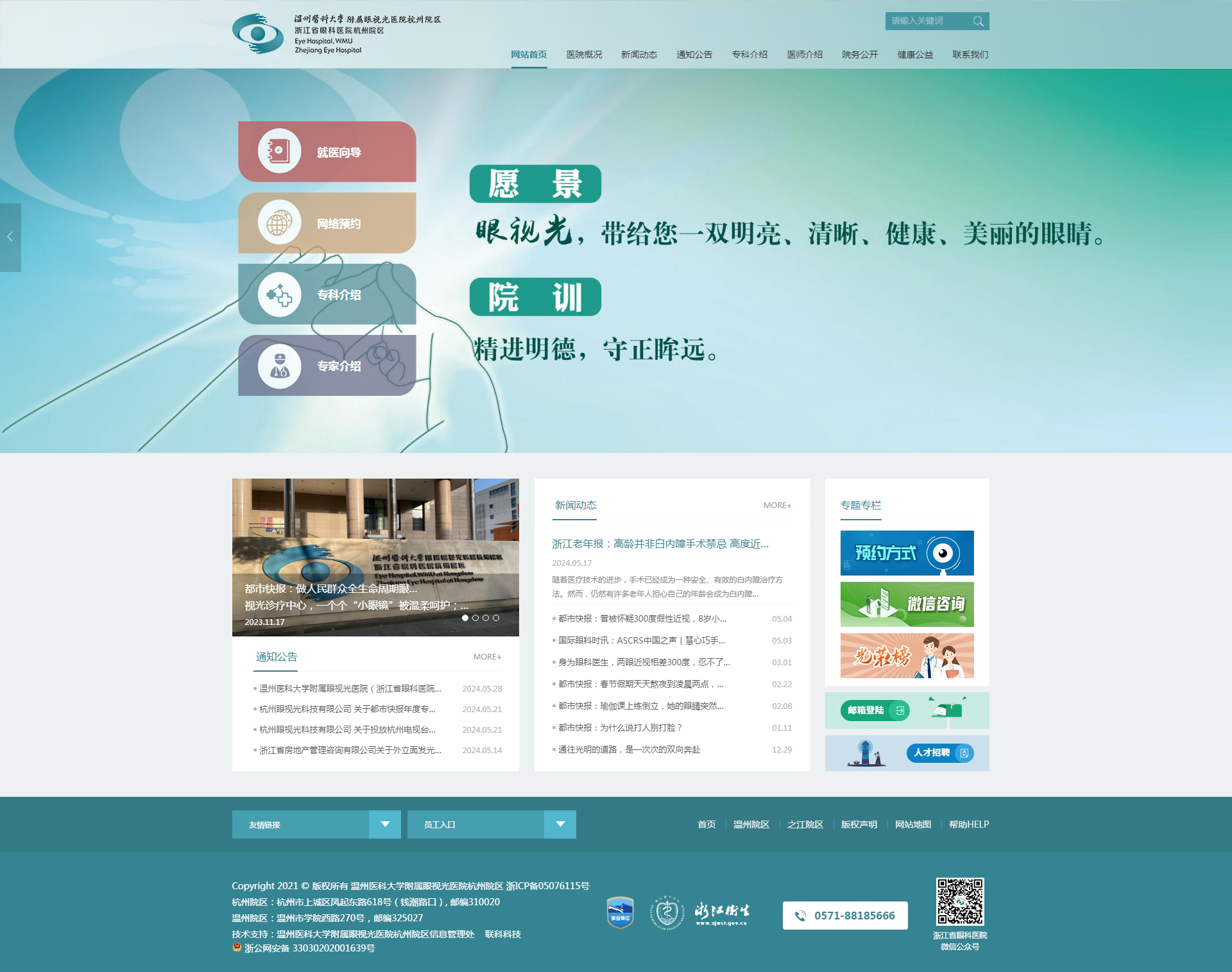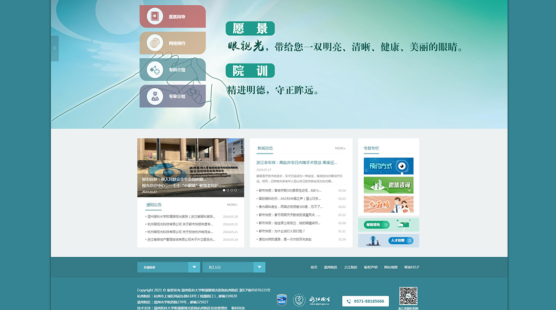 溫州醫(yī)科大學附屬眼視光醫(yī)院成立于1998年,2009年經(jīng)省衛(wèi)生廳批準增掛“浙江省眼科醫(yī)院”,2010年開設(shè)杭州院區(qū),是浙江省首家三級甲等眼科專科醫(yī)院。醫(yī)院承擔臨床醫(yī)療、醫(yī)學教育、醫(yī)學科研、預(yù)防保健等任務(wù),是國家眼部疾病臨床醫(yī)學研究中心、眼視光學和視覺科學國家重點實驗室、國家眼視光工程技術(shù)研究中心、國家藥監(jiān)局眼科疾病醫(yī)療器械和藥物臨床研究與評價重點實驗室,以及國家眼科學臨床重點專科、教育部近視防控與診治工程研究中心。