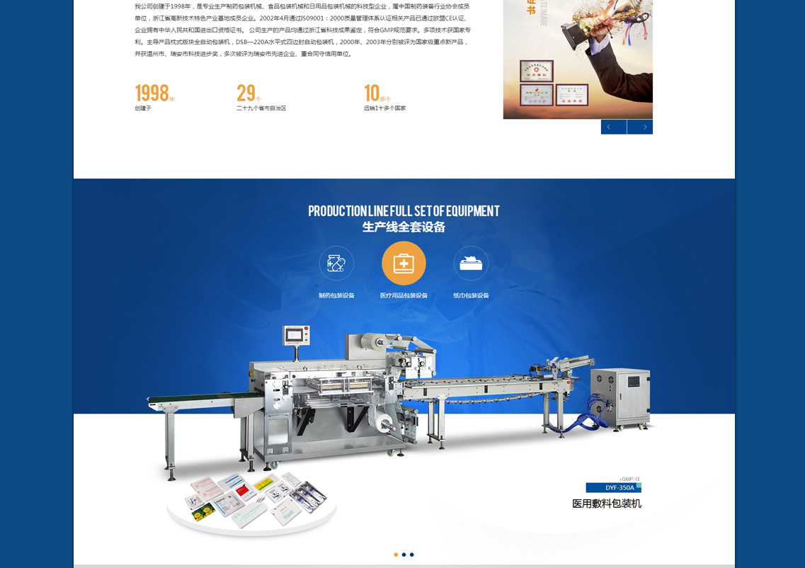 我公司創(chuàng)建于1998年,是專業(yè)生產(chǎn)制藥包裝機械、食品包裝機械和日用品包裝機械的科技型企業(yè),屬中國制藥裝備行業(yè)協(xié)會成員單位,浙江省高新技術特色產(chǎn)業(yè)基地成員企業(yè)。2002年4月通過IS09001:2000質(zhì)量管理體系認證相關產(chǎn)品已通過歐盟CE認證、企業(yè)擁有中華人民共和國進出口資格證書。