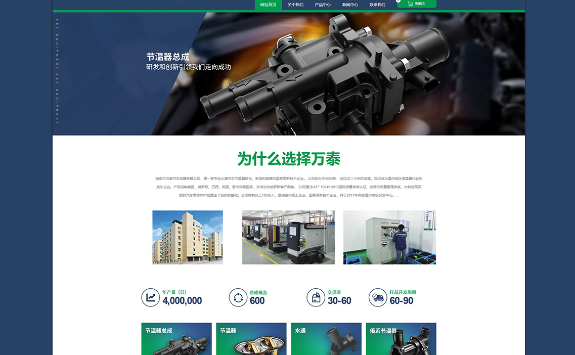 瑞安市萬泰汽車電器有限公司,擁有完整,完整的質(zhì)量管理,采集,生產(chǎn),制造,銷售和管理網(wǎng)絡(luò)的現(xiàn)代化管理體系。公司引進(jìn)國外先進(jìn)技術(shù)和設(shè)備,專業(yè)從事制造和銷售汽車各個(gè)車系的節(jié)溫器、節(jié)溫器總成、水通等產(chǎn)品。我公司堅(jiān)持走科學(xué)技術(shù)發(fā)展之路,與高等院校和研發(fā)機(jī)構(gòu)長期合作,以“追求先進(jìn)技術(shù),加強(qiáng)科學(xué)管理,優(yōu)化結(jié)構(gòu)為目標(biāo)”。在產(chǎn)品生產(chǎn)中,努力創(chuàng)造品牌是一種管理理念。