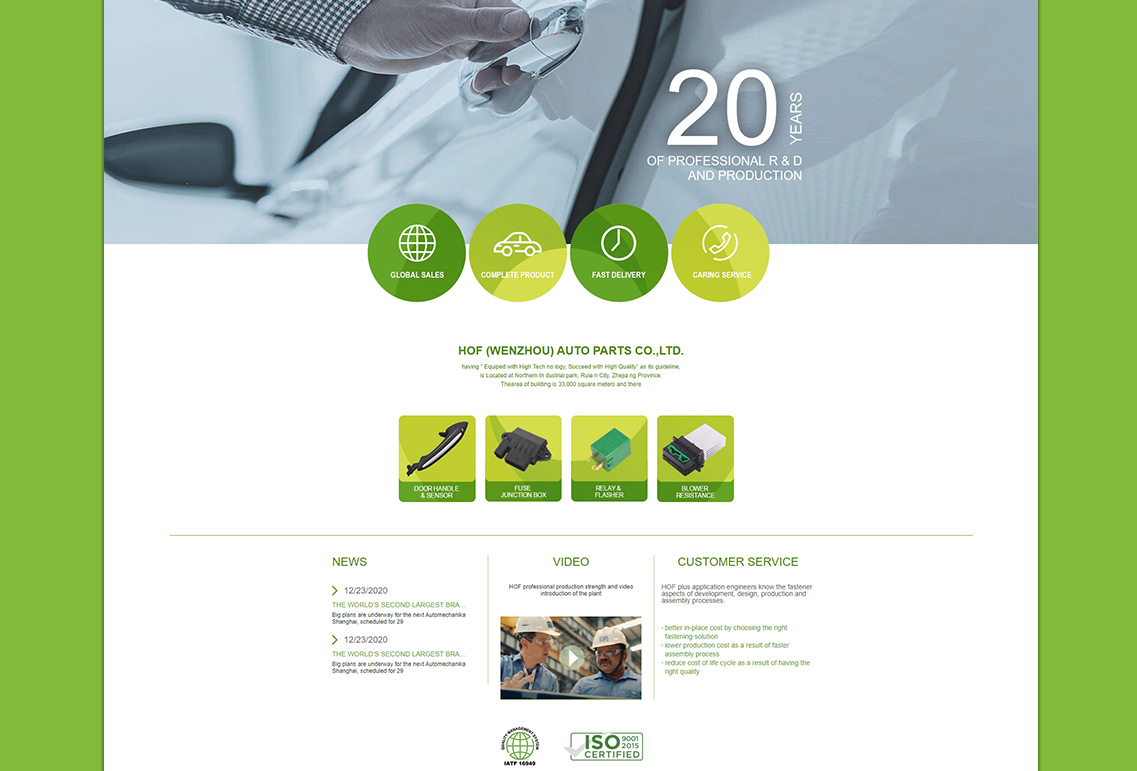 霍富(溫州)汽車配件有限公司位于浙江省瑞安市北方工業(yè)園區(qū),以“裝備高科技,成功成功”為準(zhǔn)則。 建筑面積為33,000平方米,有200名工人。 我們?cè)跓o(wú)鑰匙門把手,箱體中心,繼電器和閃光燈,加熱器鼓風(fēng)機(jī)電阻器,ECD單元,前燈控制單元等領(lǐng)域擁有15年的專業(yè)產(chǎn)品汽配經(jīng)驗(yàn)