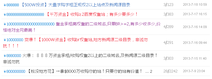 2013年7月19日百度網(wǎng)頁搜索反作弊團(tuán)隊對于一些論壇出現(xiàn)大量的高價收購二級域名或目錄的信息,絕大部分被用于作弊,例如:太原新聞網(wǎng),出售二級目錄被用于作弊。對于此類出售二級域名二級目錄的問題,將進(jìn)行嚴(yán)厲的懲罰,株連至整個站點(diǎn),直接屏蔽并清理出百度新聞源。