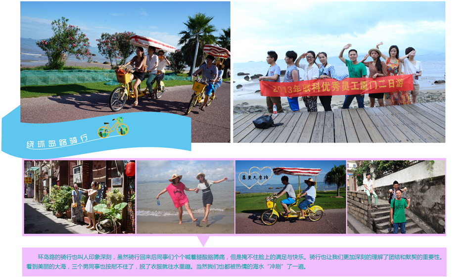 2013年6月22日,為了給員工創(chuàng)造一個放松機(jī)會,我公司后勤部全體工作人員和部分技術(shù)部工作人員前往世界聞名的"海上花園"城市廈門體驗(yàn)夏季休閑之旅。本次旅游活動主要有以下幾個環(huán)節(jié),它們分別是品嘗廈門特色小吃,繞環(huán)島路騎行,體驗(yàn)海風(fēng)及海水的清涼,乘坐輪渡享受海風(fēng),欣賞鼓浪嶼的百國建筑群,品味廈門休閑生活的節(jié)奏。22日中午,我們抵達(dá)廈門,按照原本的計劃逐一體驗(yàn)。