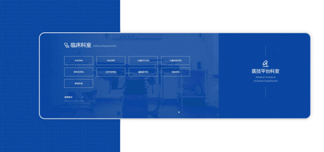 為了讓患者更好地了解醫(yī)院各個(gè)科室的特點(diǎn)和優(yōu)勢(shì),我們需要設(shè)計(jì)科室介紹的板塊。在設(shè)計(jì)中,我們使用背景圖片來(lái)展示科室的特點(diǎn)和設(shè)施情況。同時(shí)還可以設(shè)置互動(dòng)環(huán)節(jié),其中兩大科室的來(lái)回切換,可以讓患者快捷使用和清楚知曉科室的所屬,讓患者更好地了解各個(gè)科室的情況。
