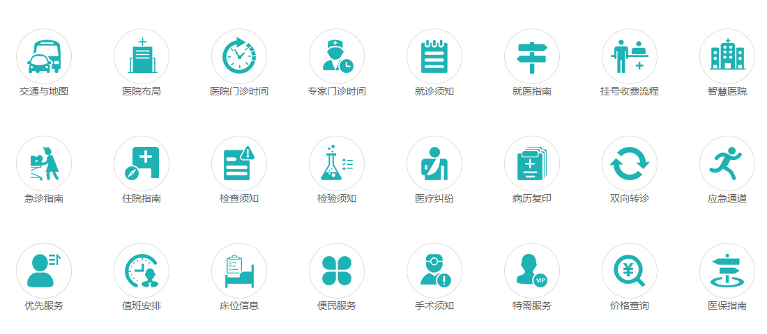 就醫(yī)向?qū)О鍓K,下方相連一張高清大圖,聯(lián)接醫(yī)院布局、交通與地圖、門診時間等等24個便利快捷入口。