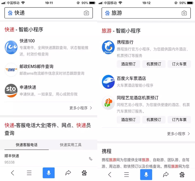 泛詞聚合卡片示例:當(dāng)用戶搜索“快遞”時,搜索結(jié)果中會匹配出“快遞100、郵政EMS郵件查詢”等3個相關(guān)智能小程序。點(diǎn)擊下方的“更多小程序”,可以查看與“快遞”或“旅游“相關(guān)的全部智能小程序。