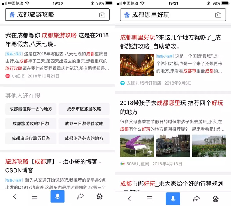 長尾詞搜索示例:用戶搜索“成都旅游攻略”“成都哪里好玩”等關(guān)鍵詞,小紅書和去哪兒旅行的相關(guān)內(nèi)容都會以智能小程序的方式出現(xiàn),并會通過醒目的“智能小程序”標(biāo)記提醒用戶。