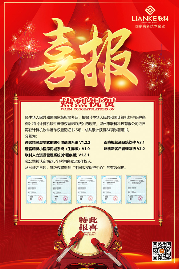 經(jīng)中華人民共和國國家版權(quán)局考證,根據(jù)《中華人民共和國計(jì)算機(jī)軟件保護(hù)條例》和《計(jì)算機(jī)軟件著作權(quán)登記辦法》的規(guī)定,溫州市聯(lián)科科技有限公司近日取得計(jì)算機(jī)軟件著作權(quán)登記證書5項(xiàng)。