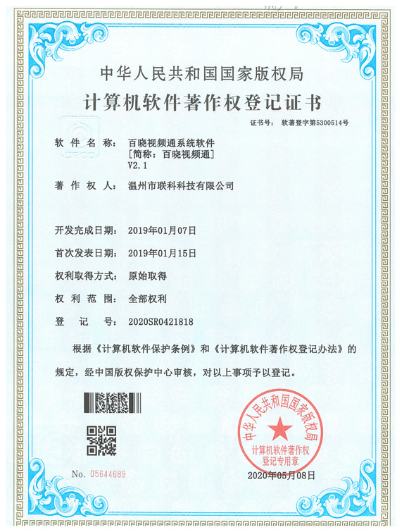 《百曉視頻通系統(tǒng)軟件V2.1》于2020年05月08日被正式授予《中華人民共和國國家版權(quán)局計(jì)算機(jī)軟件著作權(quán)登記證書》,登記號(hào)為2020SR0421818。