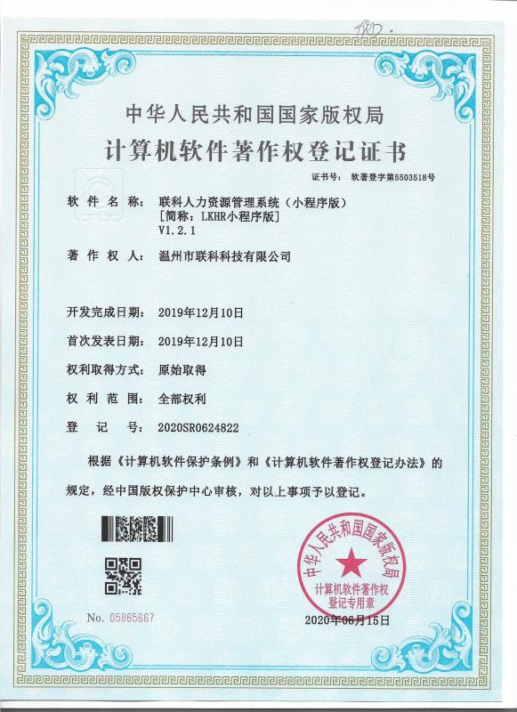 《聯(lián)科人力資源管理系統(tǒng)(小程序版)V1.2.1》于2010年06月15日被正式授予《中華人民共和國國家版權(quán)局計(jì)算機(jī)軟件著作權(quán)登記證書》,登記號(hào)為2020SR0624822。