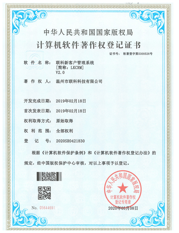 《聯(lián)科新客戶管理系統(tǒng)V2.0》于2020年05月08日被正式授予《中華人民共和國國家版權(quán)局計(jì)算機(jī)軟件著作權(quán)登記證書》,登記號(hào)為2020SR0421830。