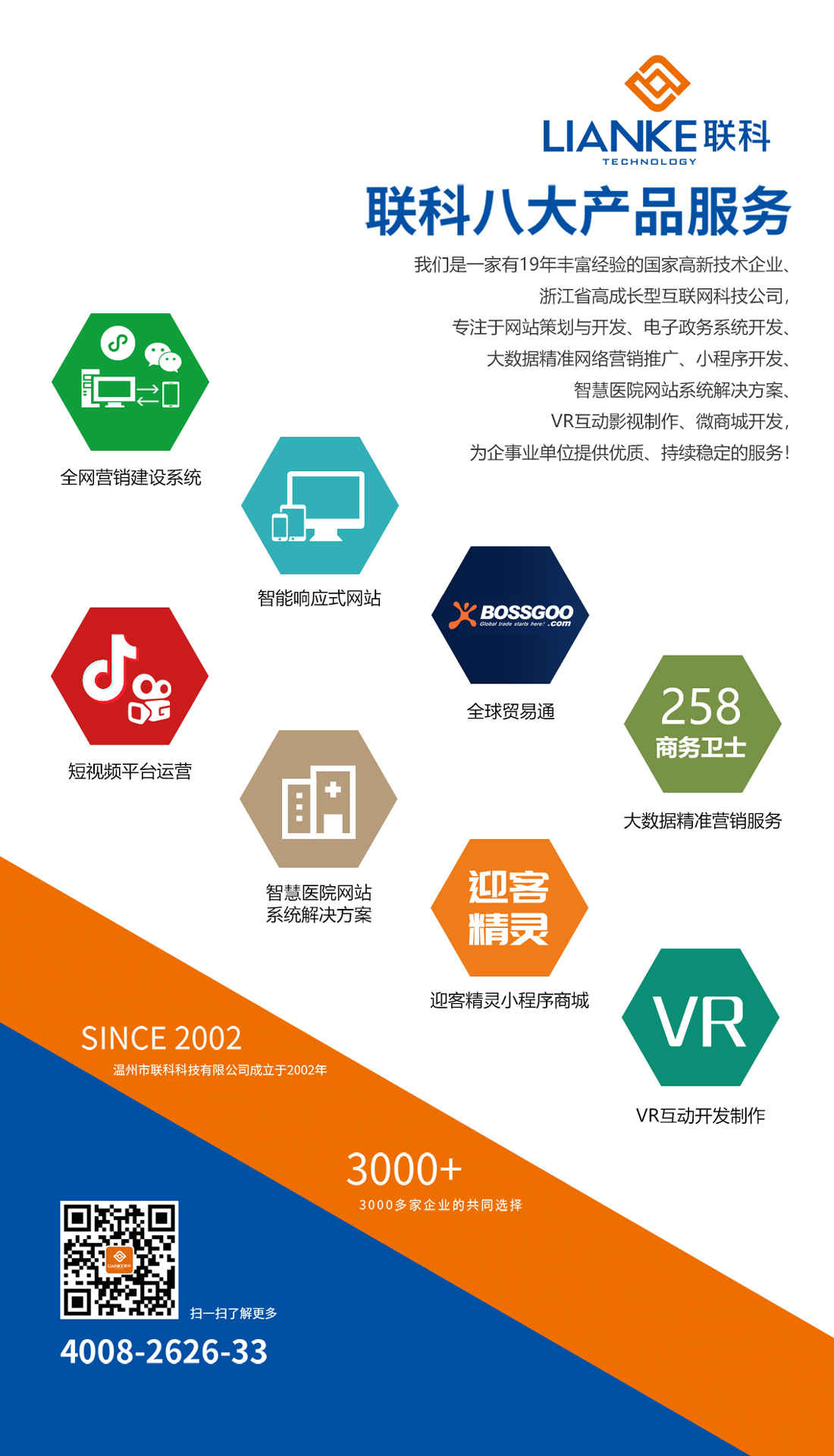 溫州市聯(lián)科科技有限公司成立于2002年,3000多家企業(yè)的共同選擇,致力于為中國(guó)的成長(zhǎng)型企業(yè)提供電子商務(wù)整體解決方案。從網(wǎng)站建設(shè)開發(fā)、微信小程序開發(fā)、網(wǎng)絡(luò)購(gòu)物商城系統(tǒng)開發(fā)、智慧醫(yī)院網(wǎng)站系統(tǒng)解決方案、移動(dòng)電商連鎖開店平臺(tái)開發(fā)到網(wǎng)絡(luò)營(yíng)銷整合服務(wù),始終圍繞企業(yè)發(fā)展過(guò)程中對(duì)銷售力提升的需求,進(jìn)行持續(xù)的服務(wù)創(chuàng)新和產(chǎn)品研發(fā)。