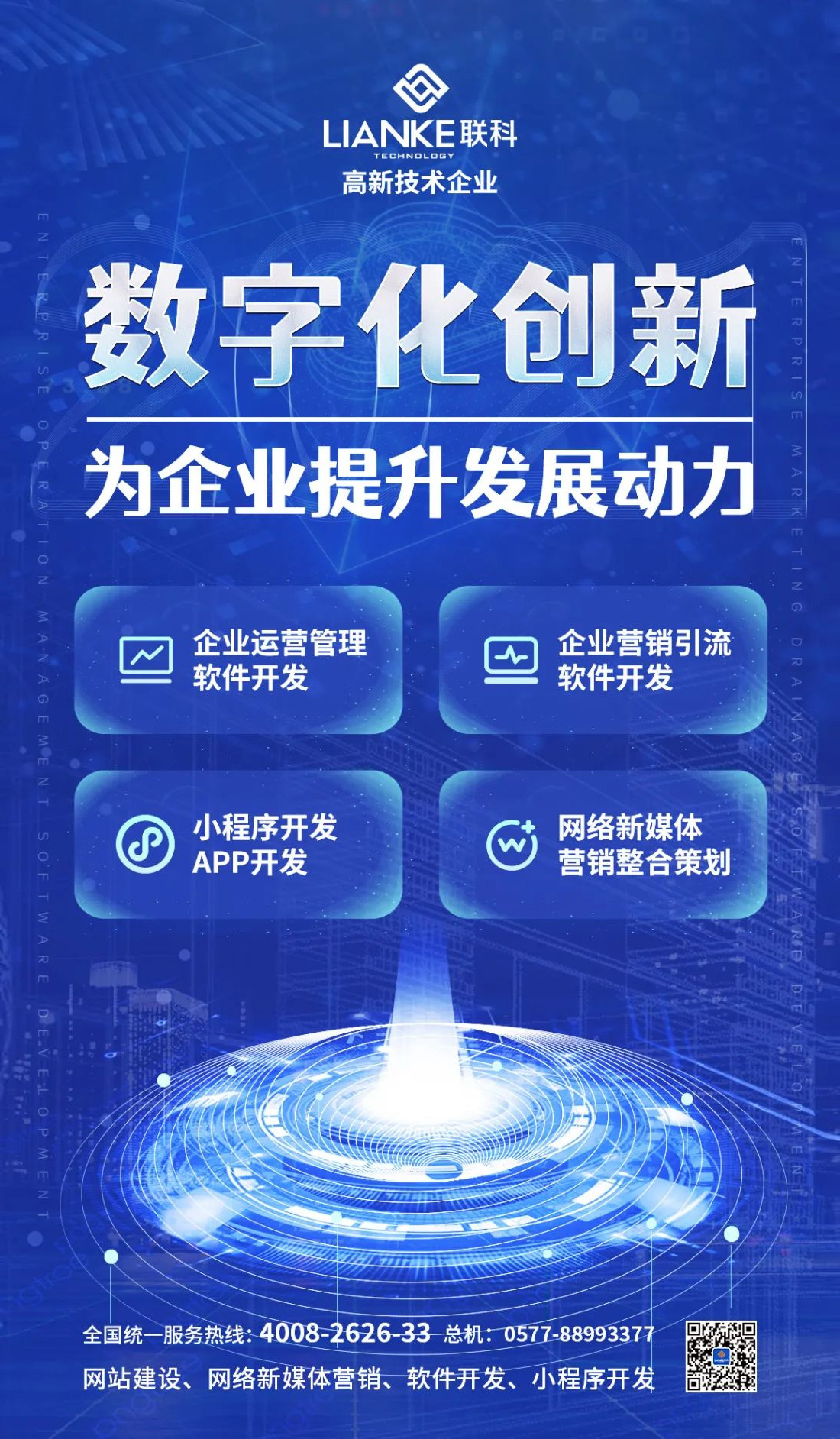溫州市聯(lián)科科技有限公司成立于2002年,主要從事互聯(lián)網(wǎng)應用軟件開發(fā)和網(wǎng)絡營銷策劃推廣,業(yè)務包括網(wǎng)站開發(fā)、小程序開發(fā)、APP開發(fā)、新媒體(微信、抖音、百度)整合營銷策劃、外貿(mào)推廣等。產(chǎn)品包括品牌定制型網(wǎng)站系統(tǒng)、四網(wǎng)合一自適應網(wǎng)站系統(tǒng)、智立方全網(wǎng)營銷系統(tǒng)、智慧醫(yī)院網(wǎng)站系統(tǒng)、學校網(wǎng)上辦事大廳系統(tǒng)、在線教育培訓系統(tǒng)、迎客精靈小程序商城系統(tǒng)、智慧教培門店運營系統(tǒng)等。