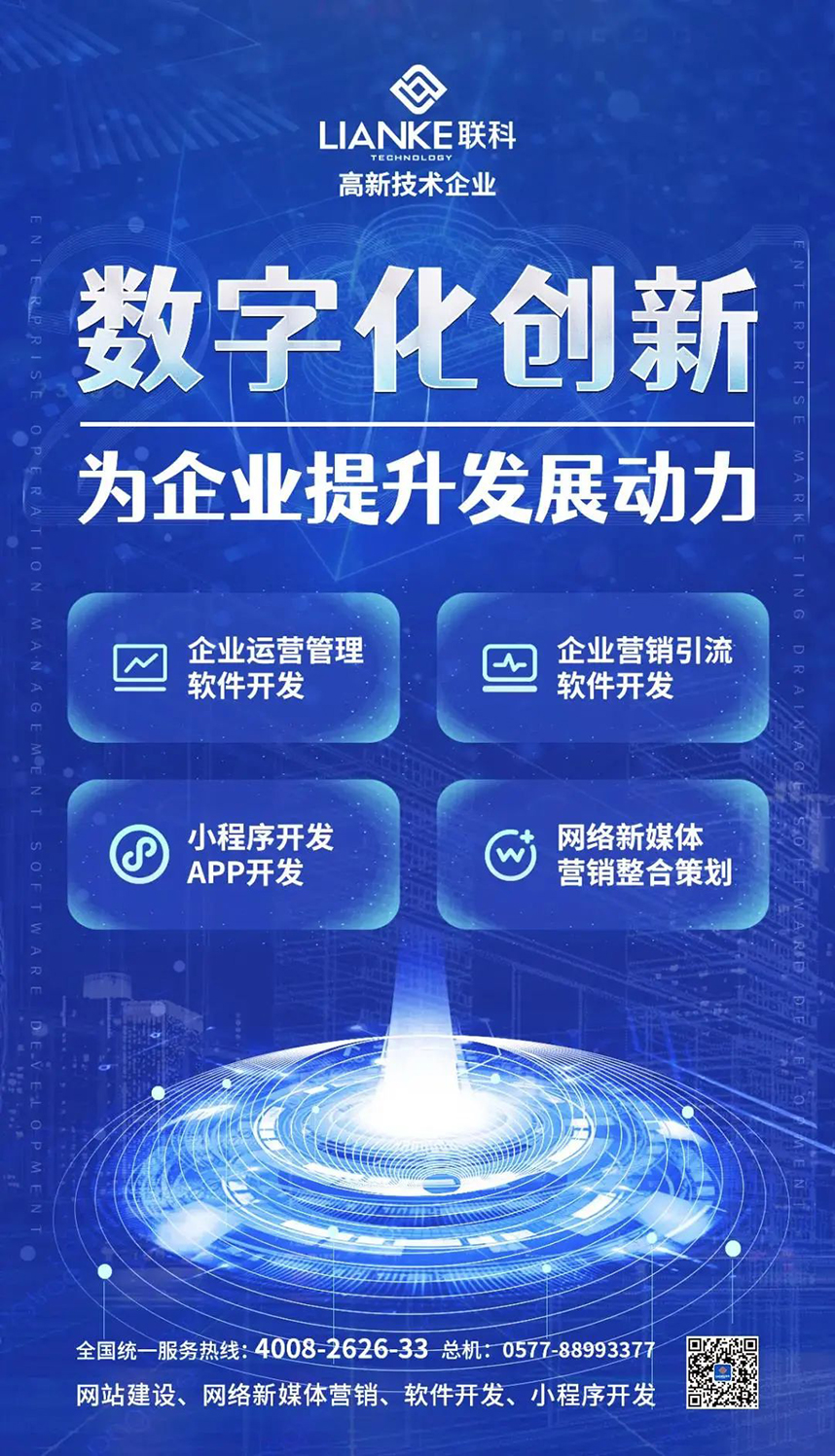 溫州市聯(lián)科科技有限公司成立于2002年,主要從事互聯(lián)網(wǎng)應(yīng)用軟件開發(fā)和網(wǎng)絡(luò)營銷策劃推廣,業(yè)務(wù)包括網(wǎng)站開發(fā)、小程序開發(fā)、APP開發(fā)、新媒體(微信、抖音、百度)整合營銷策劃、外貿(mào)推廣等。產(chǎn)品包括品牌定制型網(wǎng)站系統(tǒng)、四網(wǎng)合一自適應(yīng)網(wǎng)站系統(tǒng)、智立方全網(wǎng)營銷系統(tǒng)、智慧醫(yī)院網(wǎng)站系統(tǒng)、學(xué)校網(wǎng)上辦事大廳系統(tǒng)、在線教育培訓(xùn)系統(tǒng)、迎客精靈小程序商城系統(tǒng)、智慧教培門店運(yùn)營系統(tǒng)等。