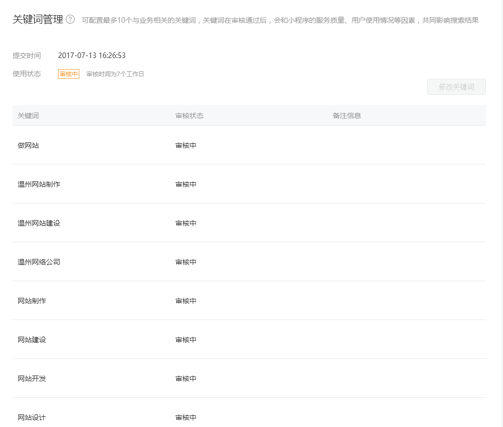 由于小程序關(guān)鍵字個數(shù)有限,只能添加10個,建議一次性添加齊全,畢竟有7天的審核日期,而且規(guī)定是和小程序業(yè)務(wù)相關(guān)詞才能通過。