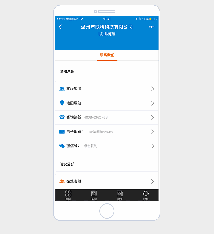 在聯(lián)系我們欄目中點(diǎn)擊“微信號”按鈕,快速復(fù)制微信號,完成添加微信好友的功能,達(dá)到瀏覽者于企業(yè)平臺之間的直接對接,提高營銷精準(zhǔn)度與好感度;