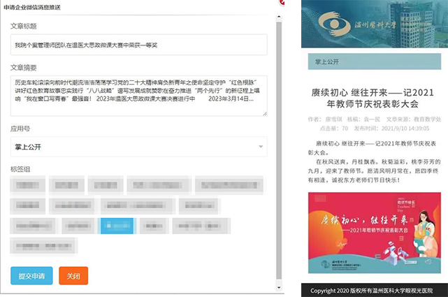 在醫(yī)院內(nèi)容管理系統(tǒng)基礎(chǔ)上開發(fā)一套接入企業(yè)微信的系統(tǒng)。能夠?qū)?nèi)容管理系統(tǒng)中的文章推送到企業(yè)微信指定的應(yīng)用號中。可選不同應(yīng)用,不同用戶標簽做到信息資源的定向推送。擁有審核機制,普通用戶申請推送,管理員審核通過后發(fā)起企業(yè)微信消息推送。極大改善了普通信息資源發(fā)布后用戶被動閱讀的弊端。