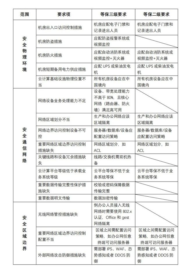 本文參考了《T/ISEAA 001-2020 網(wǎng)絡(luò)安全等級(jí)保護(hù)測(cè)評(píng)高風(fēng)險(xiǎn)判定指引》,整理出了等保三級(jí)、二級(jí)所需產(chǎn)品和要求。研發(fā)或運(yùn)維人員通過該表可直觀了解自己的系統(tǒng)與等保要求存在的差距,并做出相應(yīng)整改。